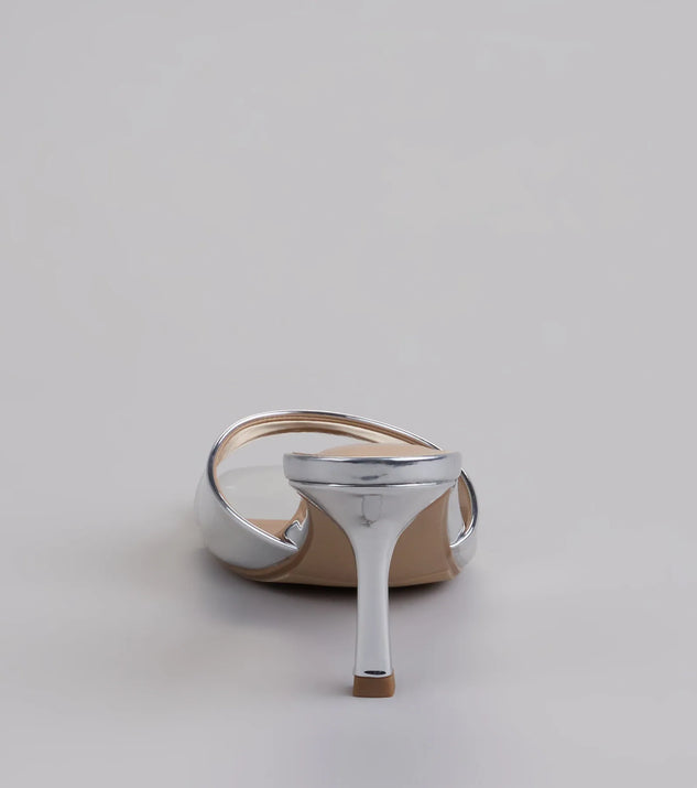 Step into glamour with these stiletto mules, featuring a stunning sleek finish that catches every light. Perfect for dressing up your day or night look.Fit & FeaturesStiletto heelSquare toeWide curved strapCushioned insoleSilver And Gold: metallic materialRed: faux leather materialRuns true to size