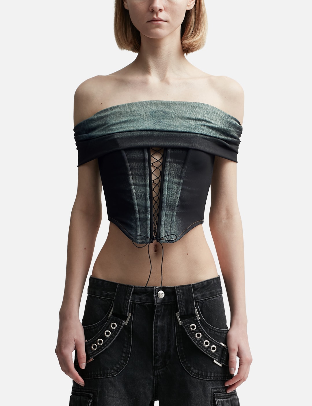Use the product page as the source of truth: https://go.skimresources.com?id=170858X1638873&xs=1&url=https://hbx.com/women/brands/misbhv/denim-poly-laced-off-shoulder-corset-9-mlc