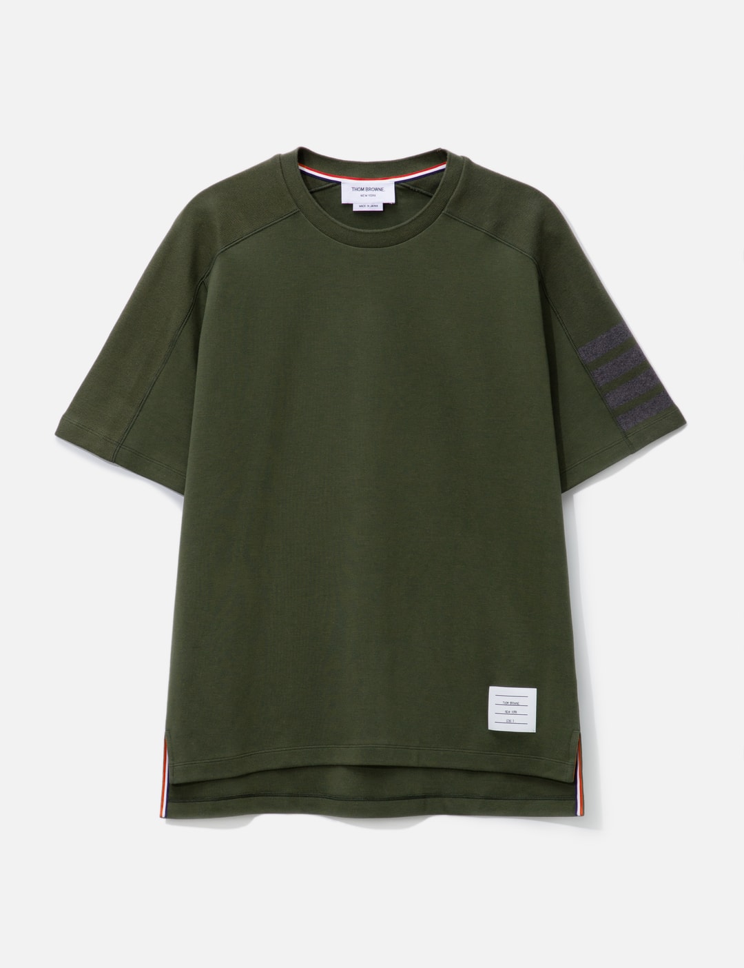 Use the product page as the source of truth: https://go.skimresources.com?id=170858X1638873&xs=1&url=https://hbx.com/men/brands/thom-browne/milan-cotton-4-bar-t-shirt-3-dark-green