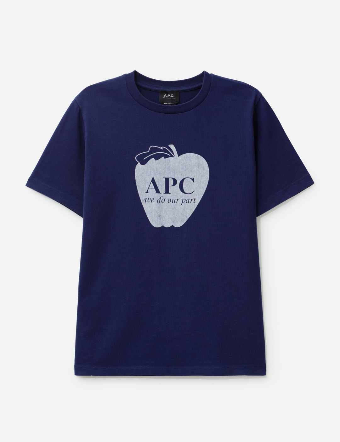 “A.P.C. we do our part” and apple printed on front centre