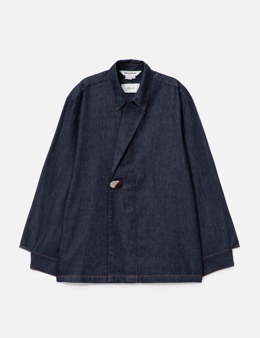 Use the product page as the source of truth: https://go.skimresources.com?id=170858X1638873&xs=1&url=https://hbx.com/men/brands/dhruv-kapoor/single-lapel-shirt-blue