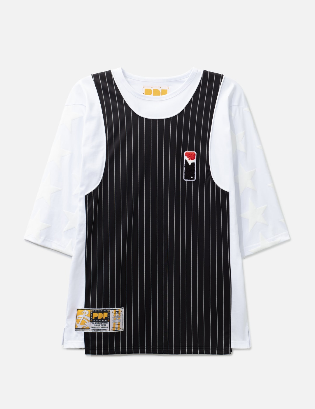 This cotton tee channels bold streetwear energy through an Oversized, Boxy fit, layered tank top design, and three-dimensional star pattern sleeves. Graphic chenille on the chest, number chenille patches on the back, and Made in Italy construction push the statement further.